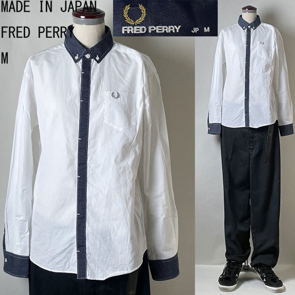 - ★【国内正規 日本製】 FRED PERRY フレッドペリー F4199 コットン 100% ボタンダウン ドット 切替え 長袖 シャツ サイズ M ホワイト