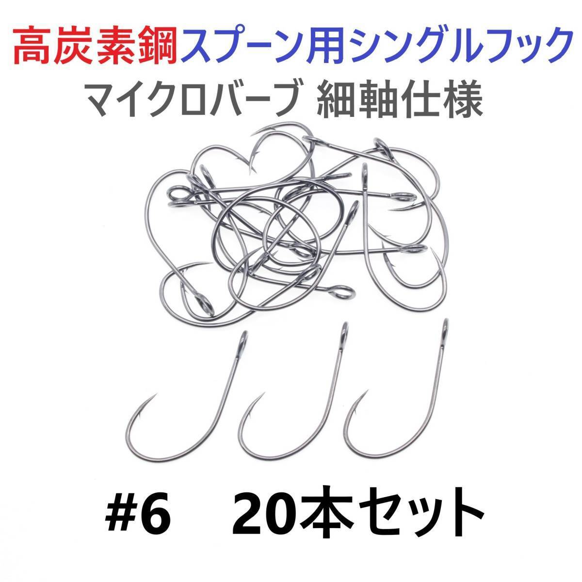> 【送料150円】高炭素鋼 スプーン用 シングルフック #6 20本セット マイクロバーブ 細軸仕様 横アイ ビッグアイ 渓流釣り 管釣り