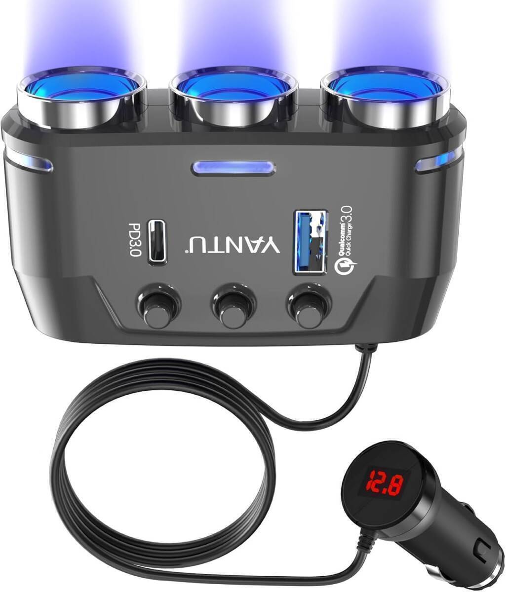 - 送料無料 YANTU QC3.0&PD 40W シガーソケット3連 シガーソケット 増設 急速充電器USBポート2連 延長ケーブル LED電圧表示 充電器 140W