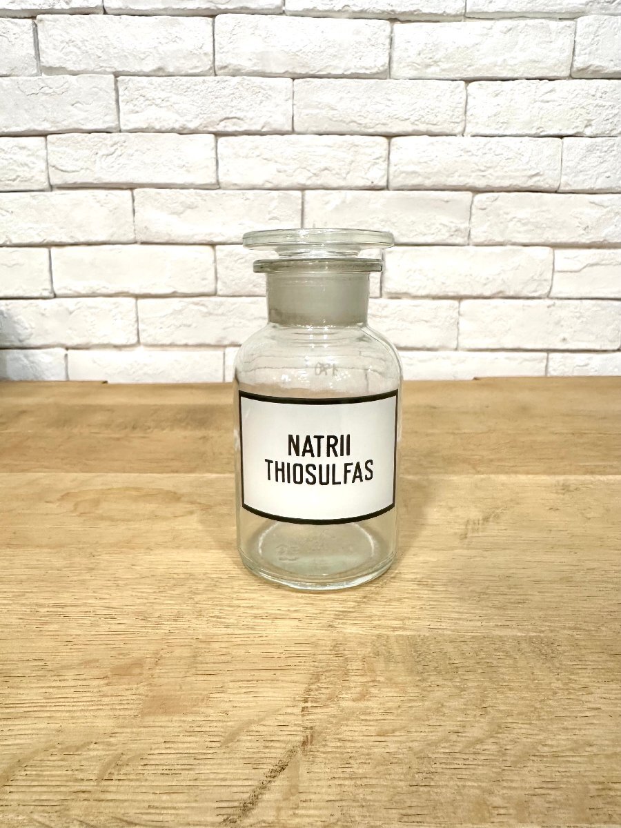 クリアガラスに、ブラックカラーでNATRII THIOSULFASの文字がデザインされた商品です。