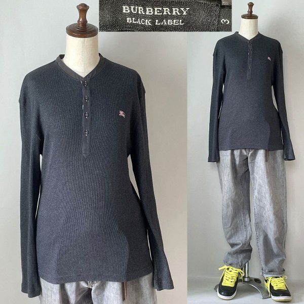 > ★【国内正規品 並品】バーバリー ブラック レーベル ホースマーク 刺繍 コットン100% ヘンリーネック リブ 長袖 Tシャツ サイズ3 ロンT