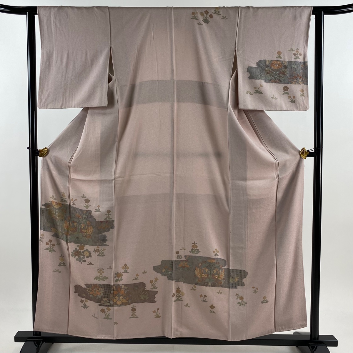 > 訪問着 身丈158cm 裄丈62cm S 袷 向かい鳥 草花 刺繍 金彩 灰桜 正絹 秀品 【中古】