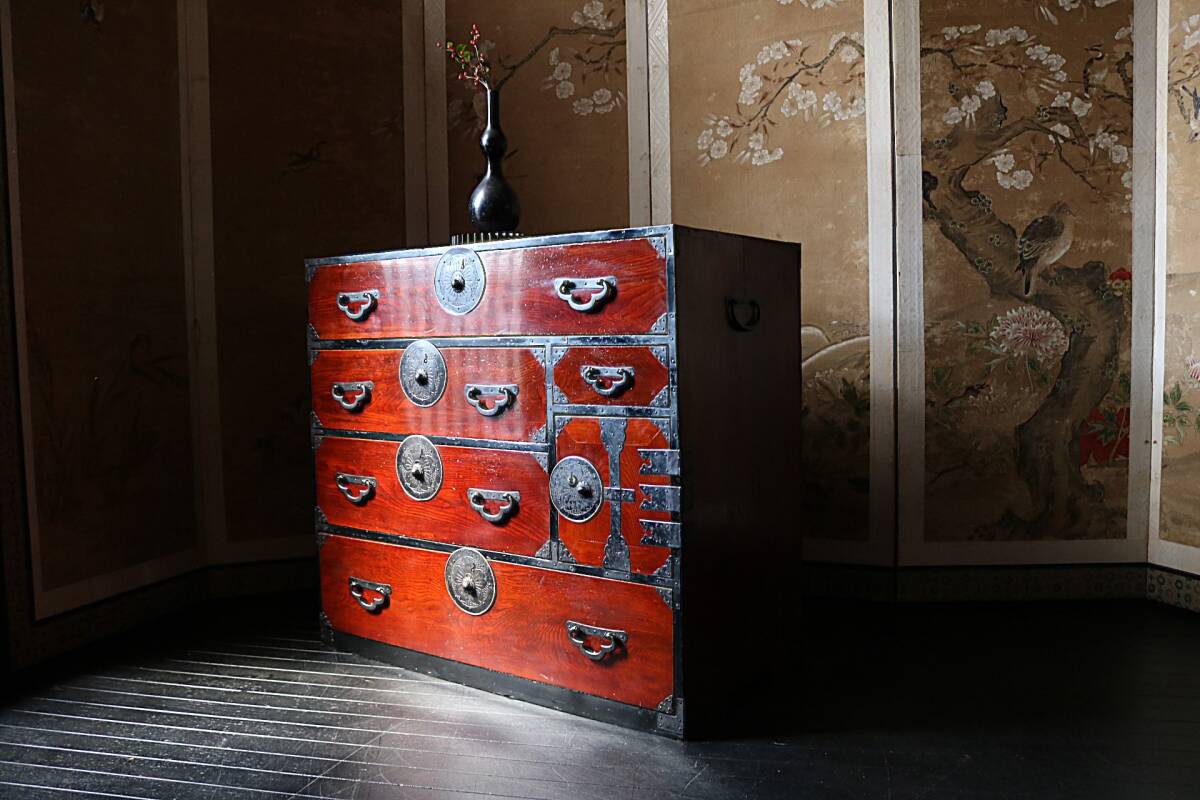 > 【伊董】C134.アンティーク!大ぶり!希少!古い時代箪笥山形県米沢地方向こう桜丸覆輪金具枕箪笥栗明治 #米沢箪笥 #和家具 #小箪笥