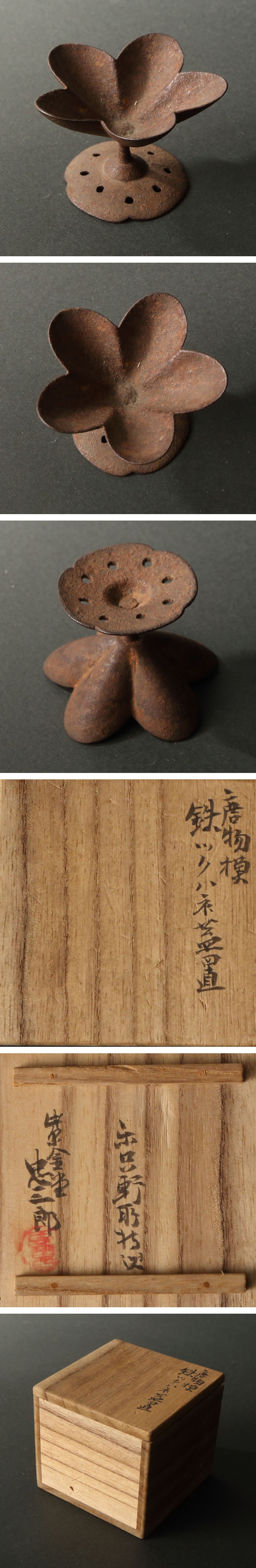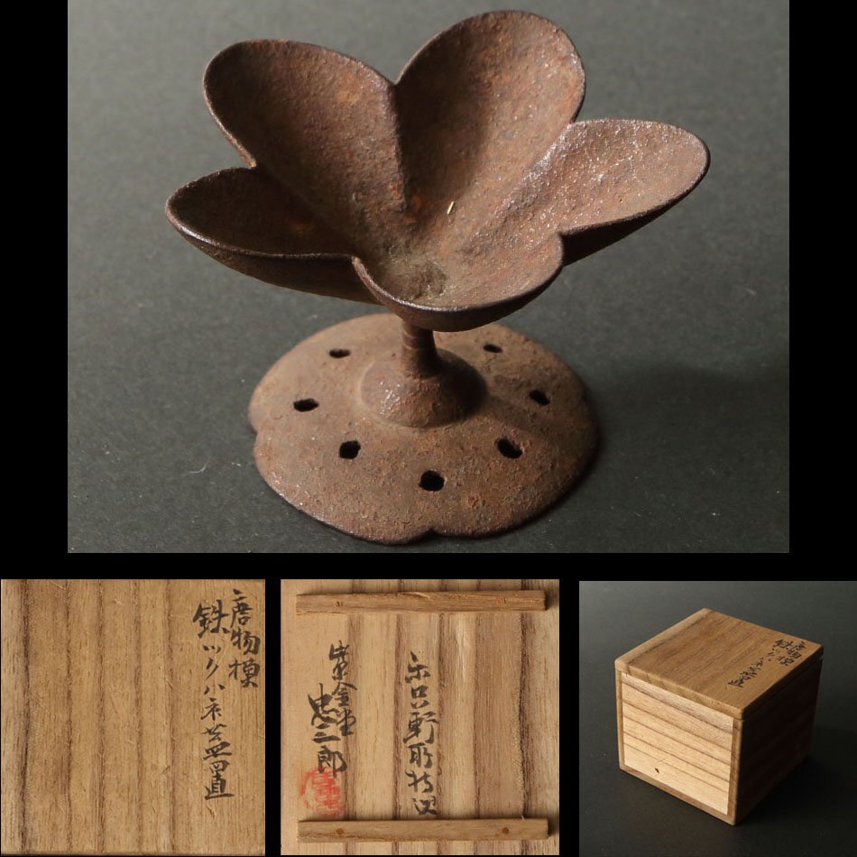 - 【深和】八代紫金堂忠三郎 唐物摸鉄ツクハネ蓋置 楽只軒所持写 共箱(突羽根蓋置 茶道具 名古屋 松尾流 加藤忠三朗 釜師 鉄蓋置 尾張藩)