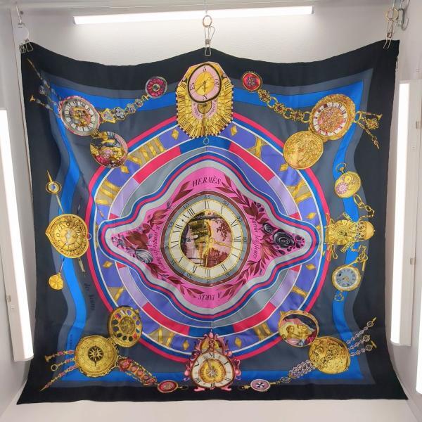 > エルメス カレ90 大判スカーフ 花の中で過ごす時間 ブラック×ブルー×ピンク マルチカラー シルク100% 絹 HERMES ◆2005