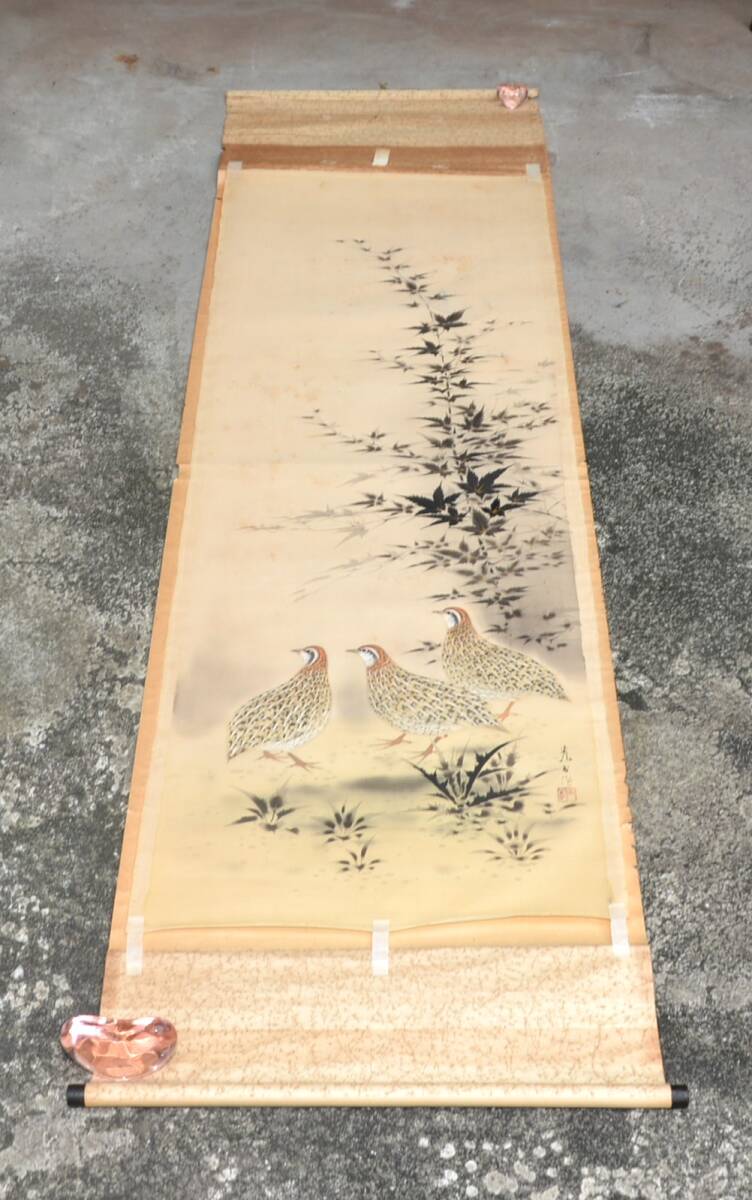 - 【模写】 68◆初荷です ◆掛軸 松村光村 彩色群鶉 絹本 ◆紙箱 福井県出身 昭和の日本画家