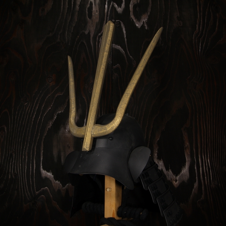 > 大前立て 三又槍 金塗 木製 家紋 前立 前立てオス 真鍮 鶴首 等身大 甲冑 兜 鎧兜 武具 検/ 仁王 samurai armour 24k a727hoko k24
