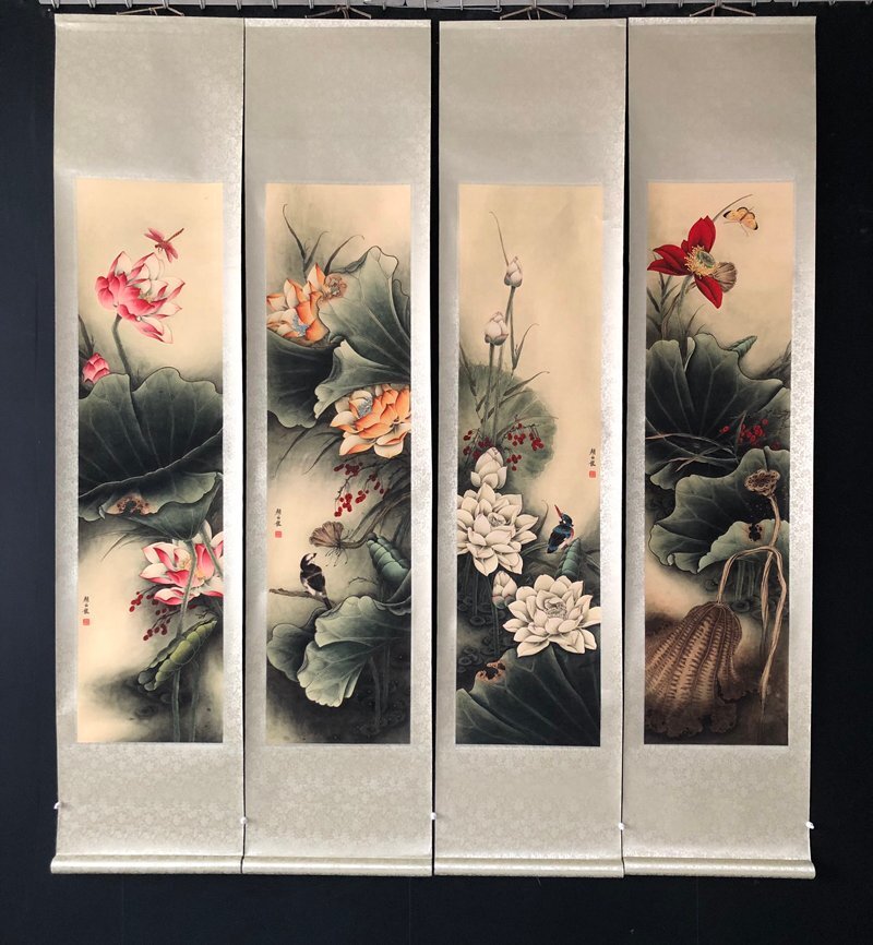 - 中国美術 掛軸 装飾 4枚セット 蓮の花 中国書画 美術品 鑑賞 コレクション zh213