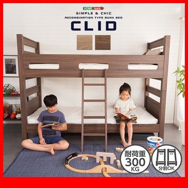 > 二段ベッド★木目調3Dシート 二段ベッド/分割可 シングル×2 キング 通気性の良いすのこ床 耐荷重300kg/ナチュラル ウォールナット/zz