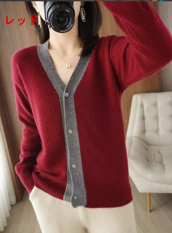 > レディース カーディガン 秋冬 ニットジャケットvネック ニットセーター アウター ショールカーディガ 羽織り レッド フリーサイズ