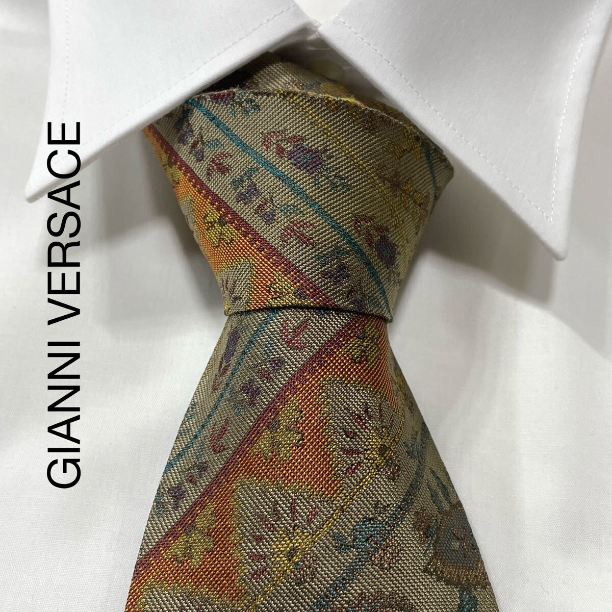 - GIANNI VERSACE ジャンニヴェルサーチ ペイズリー ボタニカル ストライプ ジャガード シルク ネクタイ 日本製 ブラウンカーキ TG2939