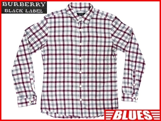 - 即決★BURBERRY BLACK LABEL★メンズM 廃版 チェックシャツ バーバリーブラックレーベル 2 白 えんじ 三陽商会正規 ナイト刺繍 長袖