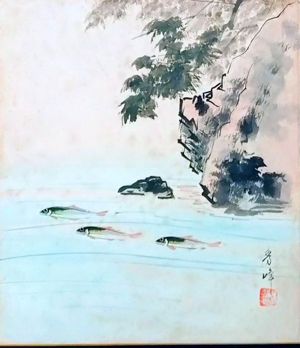 - D25100527〇彩色木版画画 色紙 清流 石川秀峰 昭和年代〇和本古書古文書〇和本古書古文書