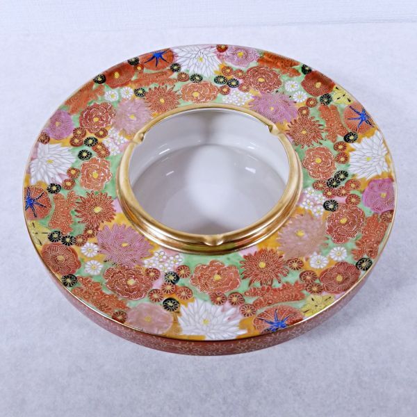 - 九谷幸洋 九谷焼 幸洋 灰皿 直径 約27cm 高さ 約6.5cm 金彩 色絵 花 灰器 灰落 喫煙 道具 陶磁器 伝統 工芸品 インテリア