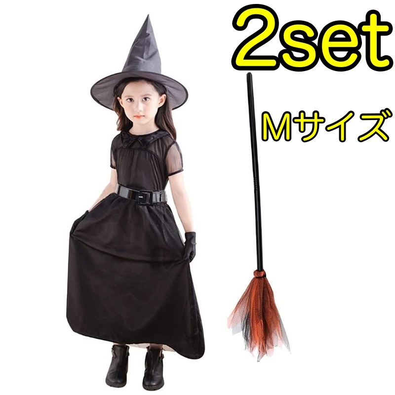 - (2set)[LIXTONE] ハロウィン コスプレ 子供 魔女 Mサイズ キッズ ほうき付き 5点セット 女の子 仮装 衣装