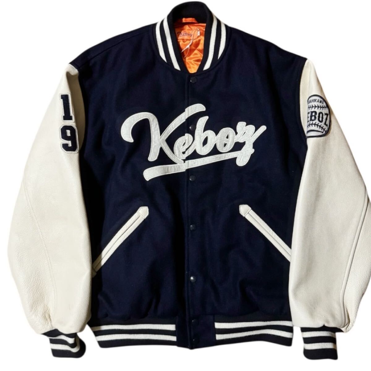 - 雰囲気抜群 keboz 袖革 バックロゴ メルトンスタジャン ネイビー Lサイズ