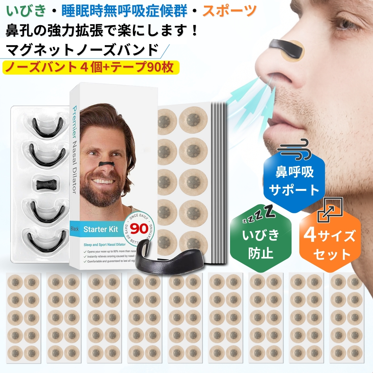 - いびき専門家監修 マグネットノーズバンド いびき防止【マグネットバンド4サイズ+テープ90枚】 鼻腔拡張テープ 磁石 いびき対策