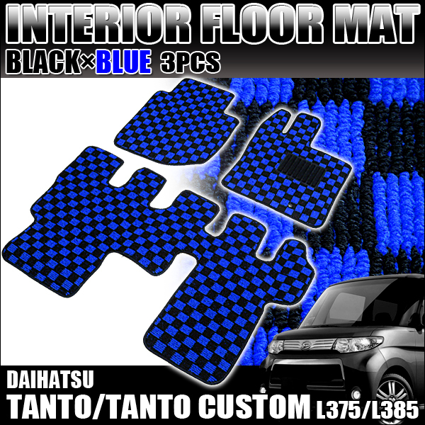- タント カスタムL375 L385 フロアマット 汚れ防止 滑り止め 黒×青 市松柄 FJ0523