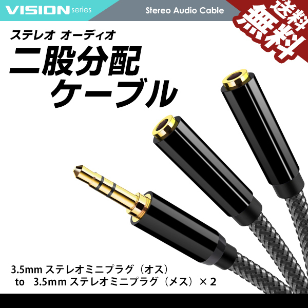 > イヤホン オーディオ 二股 分岐ケーブル 25cm 3.5mm ステレオミニ プラグ ジャック 金メッキ メッシュ 分配 コード ネコポス 送料無料