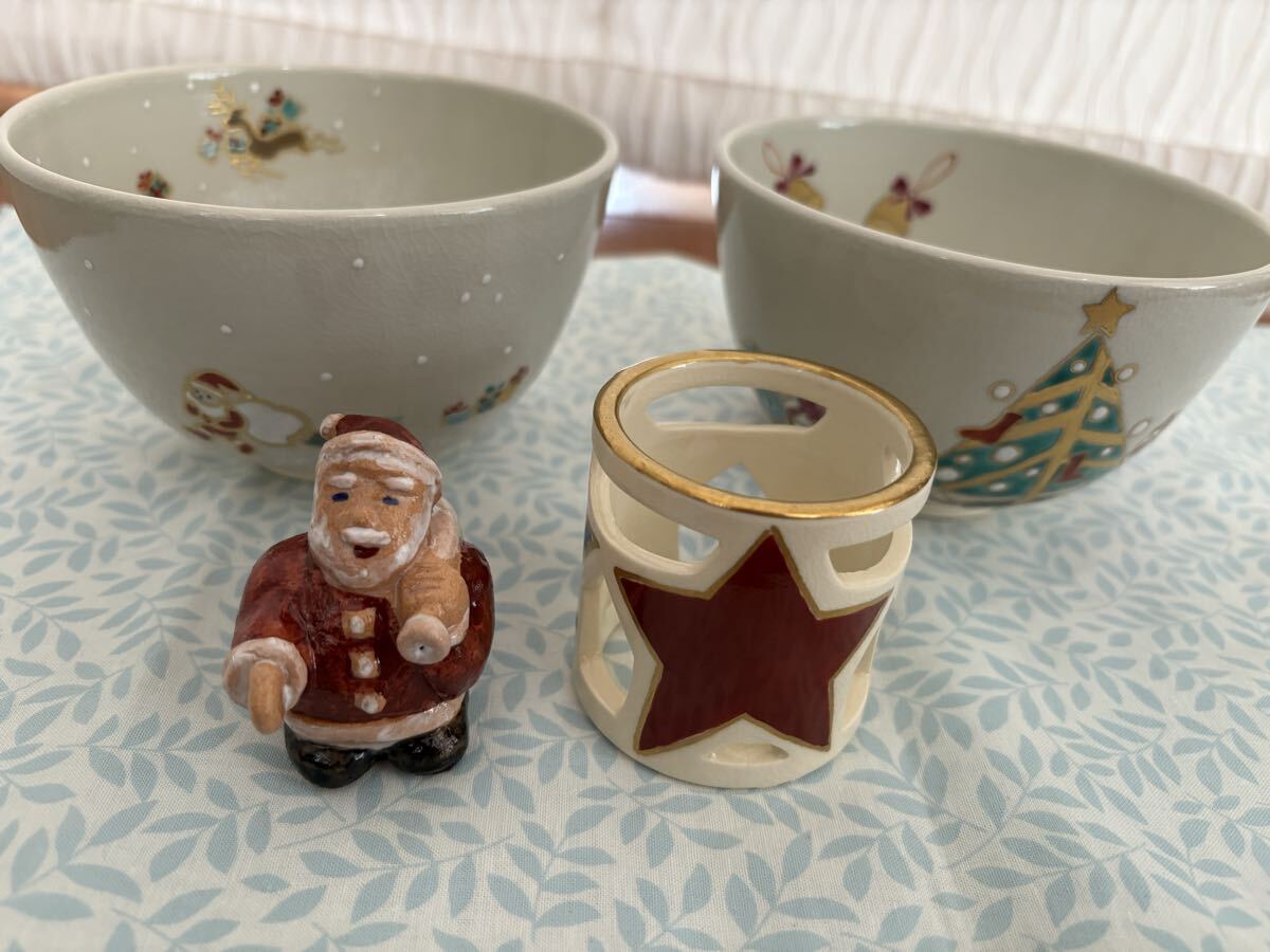 - クリスマスのお茶会に!クリスマス柄抹茶(茶碗)二つ、御室窯・仁清「星」蓋置、一陶人窯・長谷川剛 作「サンタ香合」4点セット!美品