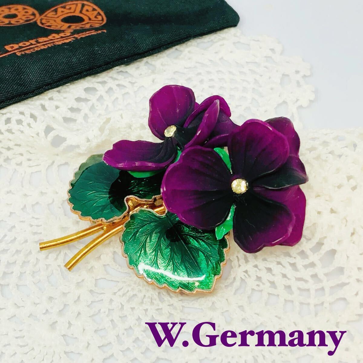 > 西ドイツ製 すみれ スミレ 花 パープル ゴールド エナメル ラインストーン ブローチ W Germany アンティーク ヴィンテージ ドイツ 蚤の市