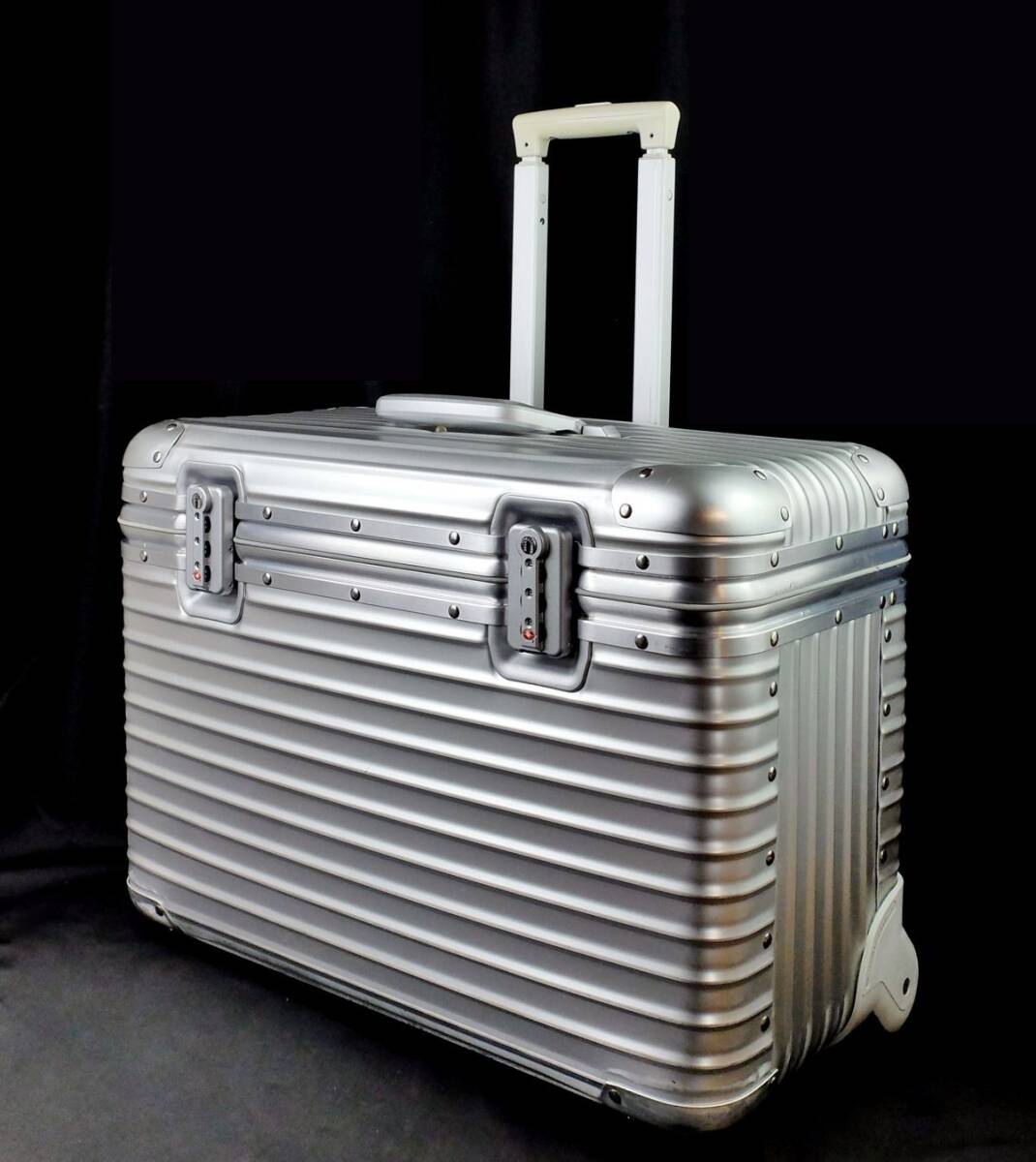 ●リモワ トパーズ 920.51 46リットル 2輪 RIMOWAのアルミニウムケースで最 も人気の高いトパーズシリーズのパイロット・トロリーの2輪の年代モデルです。2輪モ デルは大分以前より製造中止となり、年々入手が困難となってきた希少モデルで、中で も大型(.51) 46リットルモデルは迫力とその大きな積載容量で非常に高い人気となって います。(大容量の必要がない場合は操作性・機動性・狭い通路の走破性では一回りコ ンパクトな.50をお勧めします。)