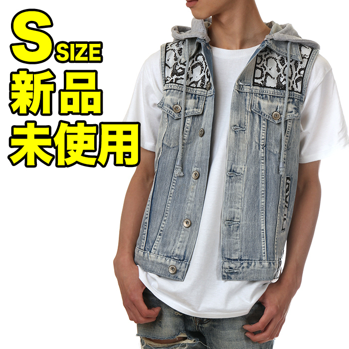 > 【新品】DFYNT デニムベスト S インディゴ×パイソン柄 ディファイエント メンズ レディース デニム ベスト Gジャン USAモデル