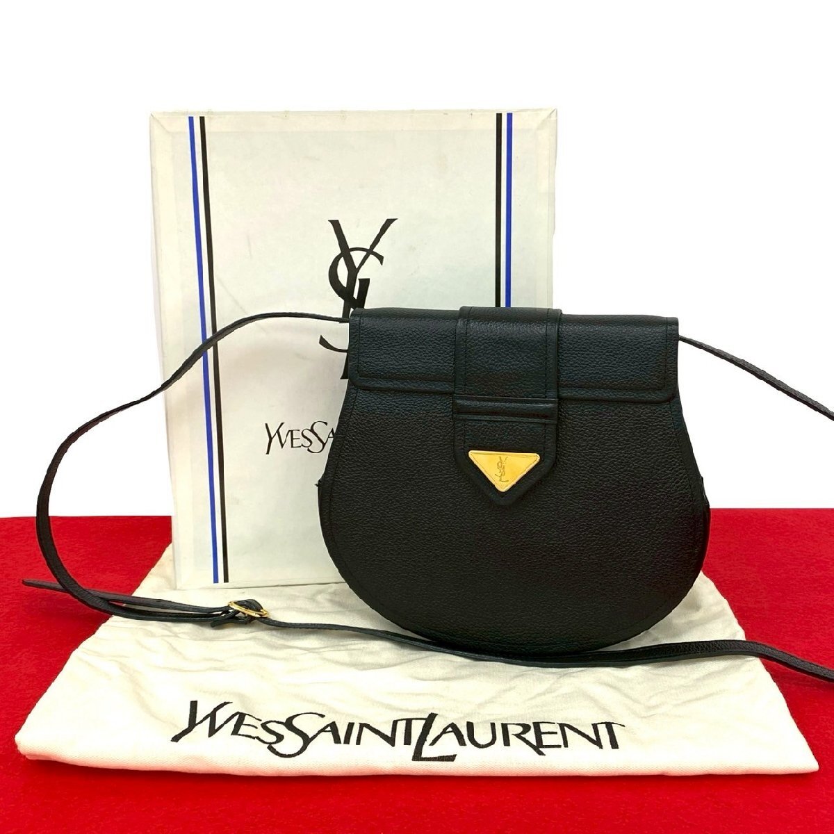 > 極 美品 箱 袋付き YVES SAINT LAURENT イヴ サンローラン YSL ロゴ 金具 レザー 本革 ショルダーバッグ ポシェット ブラック 19091