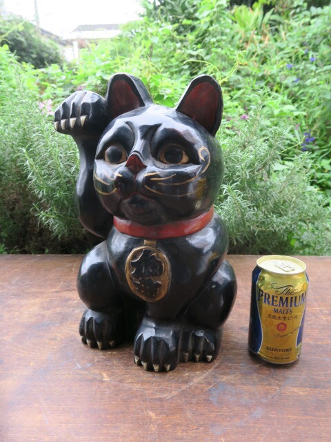 - ◆麦屋◆古い招き猫 木製 黒猫 横200㎜ 縦195㎜ 高さ335㎜ 約4kg 検索用(縁起物 一木彫 黒漆塗 大正期 昭和前期)