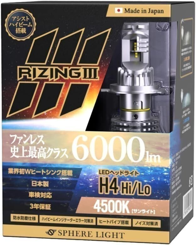 > 3年保証 スフィアライト ライジング3 RIZING3 H4 Hi/Lo 12V用 4500K ファンレス 日本製 LED ヘッドライト 6000lm 車検対応 SLRZH4A045