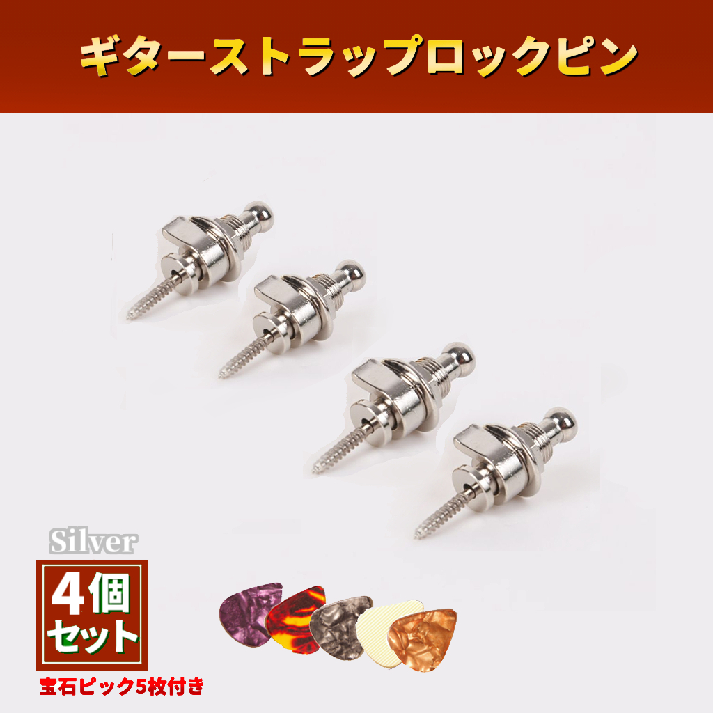 > ギターストラップロックピン 4個セット シルバー エレキ アコギ ベース 落下防止 着脱式 エンドピン 紐 ベルト 留め具 留め金