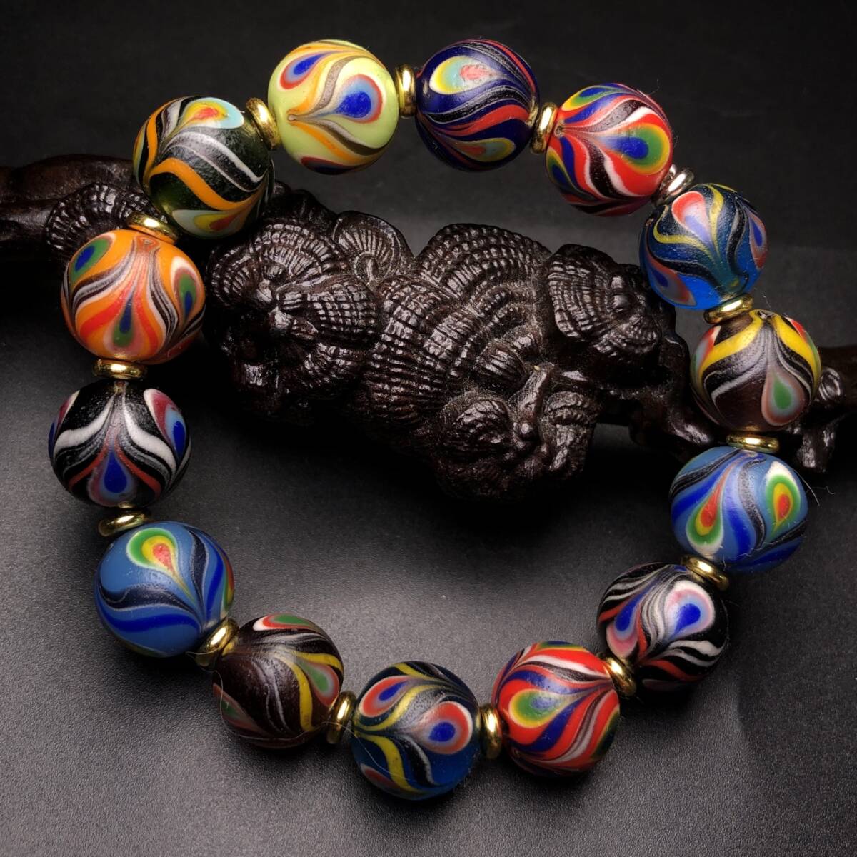 - PTA#0341【3.1】人間国宝 中国骨董 和田玉 玉石 印章 彫刻品【老瑠璃蓮華古珠腕輪】 時代物 本物 珍品旧蔵 伝世家珍