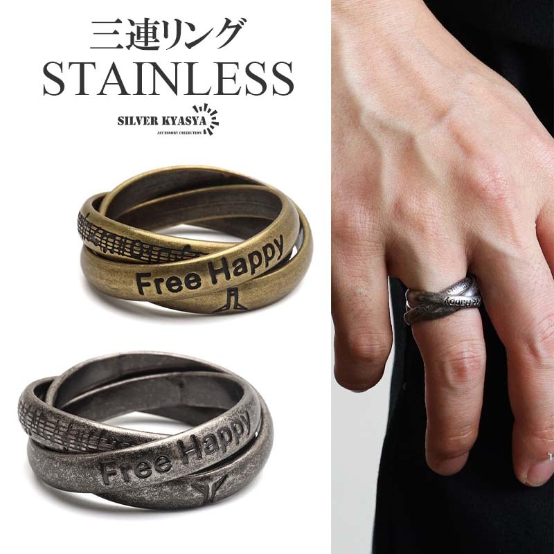 - (シルバー、14号) ステンレス 3連リング アンティークリング 英字 メンズリング ゴールド シルバー 指輪 金アレ対応