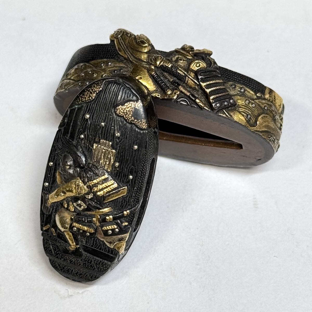 - 縁頭 宇治川合戦図 後藤本家を彷彿とさせる作域 赤銅魚子地 高彫 金銀象嵌 金色絵 江戸期 時代本歌 桐箱付 (検) 刀装具 小道具 後藤 金工
