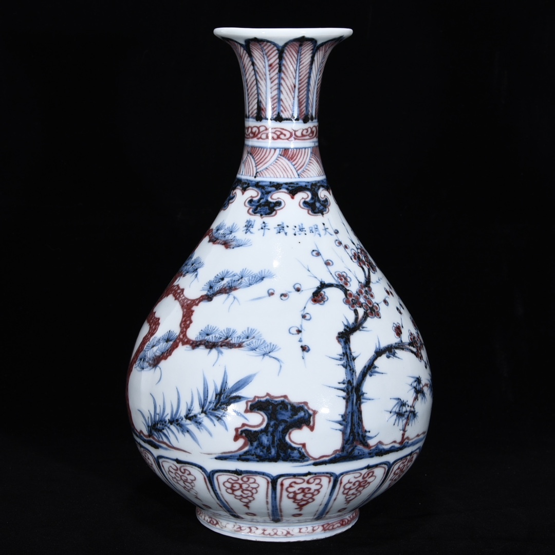 - A_YF0455【惠】人間国宝 中国骨董 陶芸 磁器【明洪武青花釉里紅松竹梅紋玉壺春】工芸品 施釉陶 青花磁 陶芸 置物 收藏品