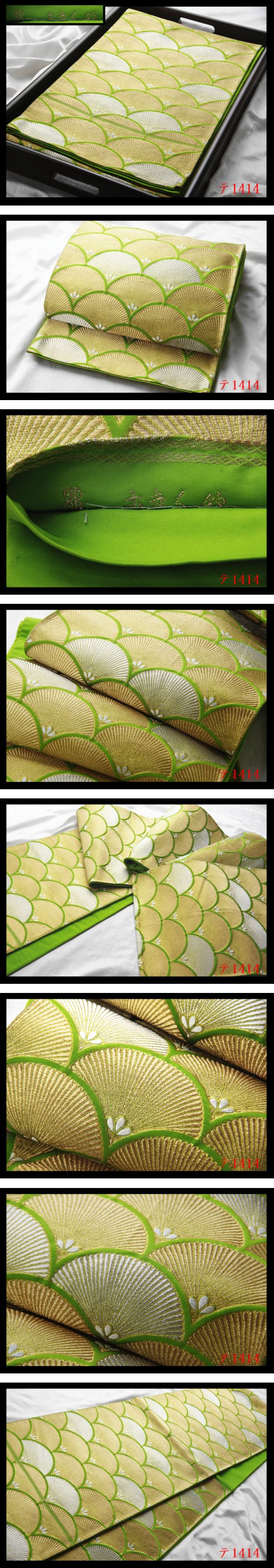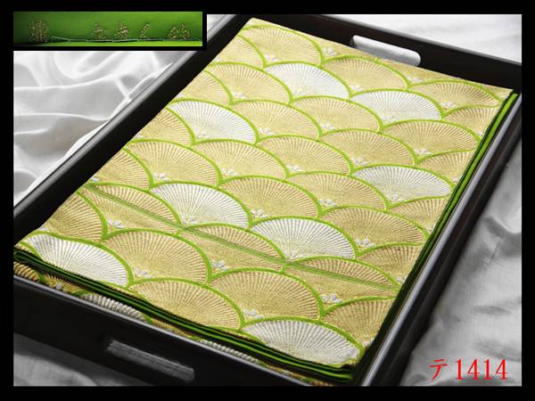 - 蔵【テ1414】西陣美品 二百年老舗ブランド服部織物 青海波松紋 萌黄色地 正絹純金糸六通高級美術袋帯◇検簪着物名古屋帯和装小物帯締め