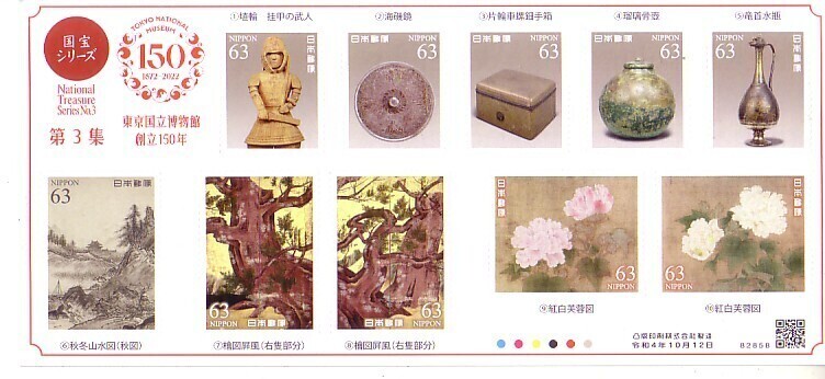 - 「国宝シリーズ 第3集 東京国立博物館創立150年」の記念切手です