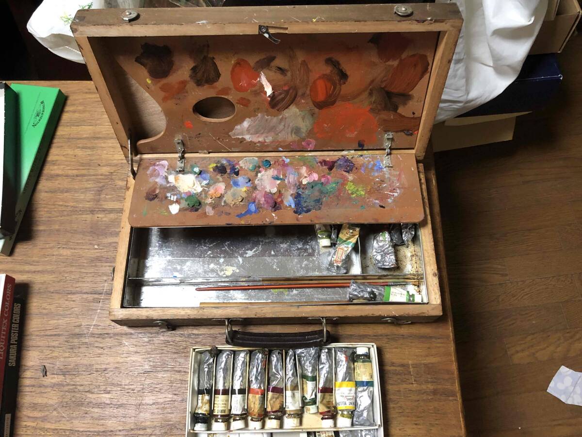 - 【美術講師使用品】木製 油絵セット 画箱 パレット 油絵の具 アクリル 画材 携帯用 イーゼル 木箱 パレット付 中古 油絵具