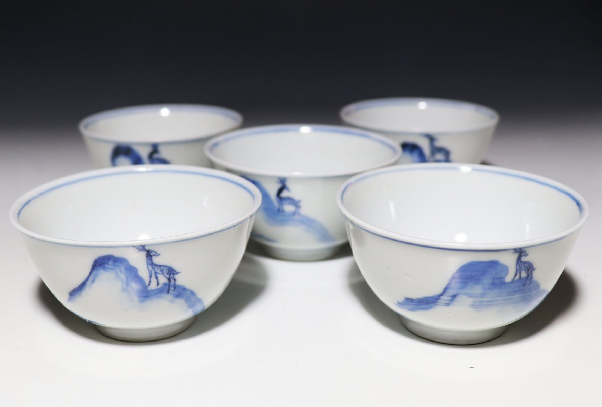 - 【桃】煎茶道具:清朝期染付山鹿図煎茶碗 五客