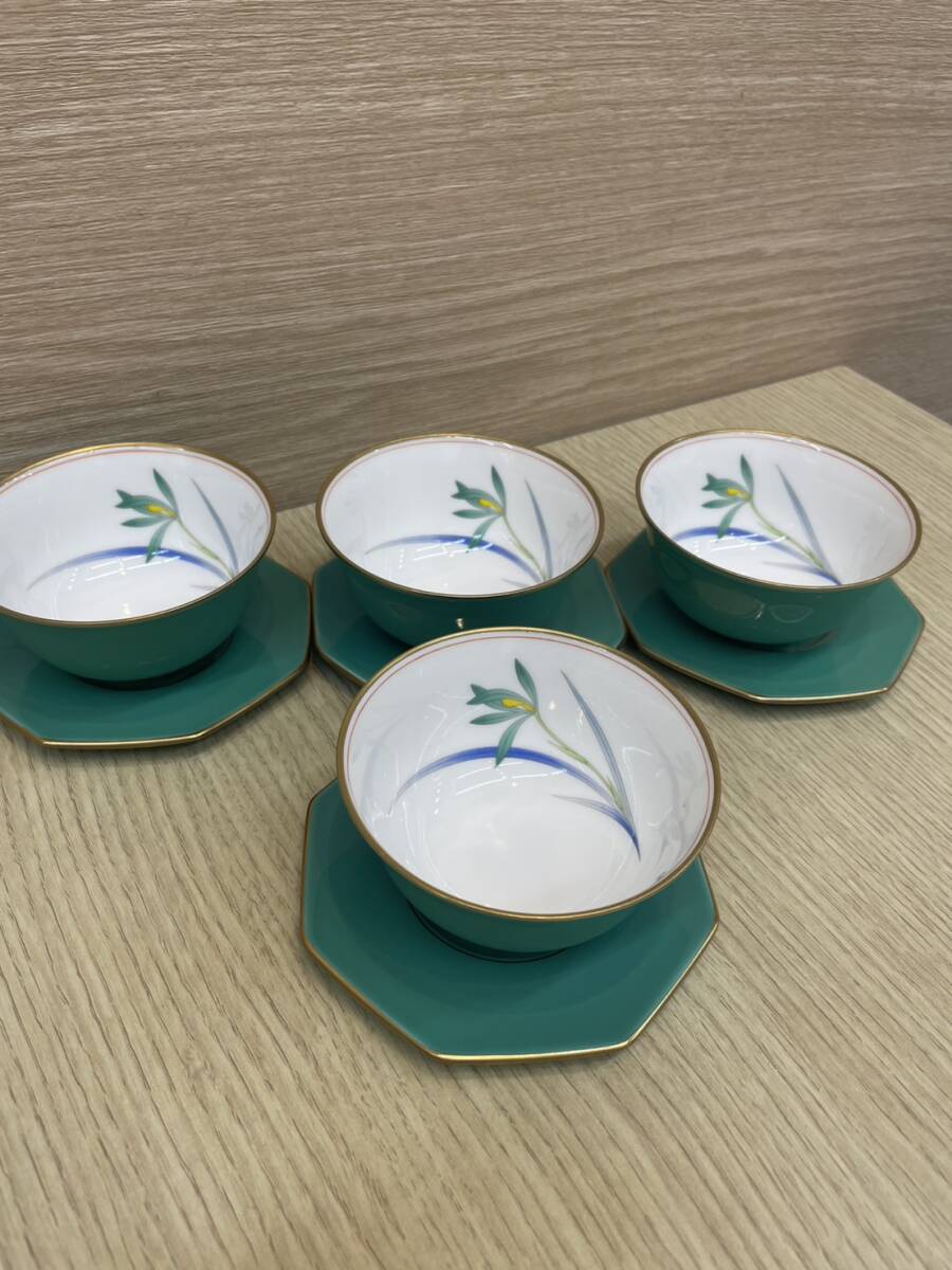 - 【新品未使用!!】香蘭社 湯呑み カップ&ソーサ 4客セット グリーン蘭 有田焼 工芸品