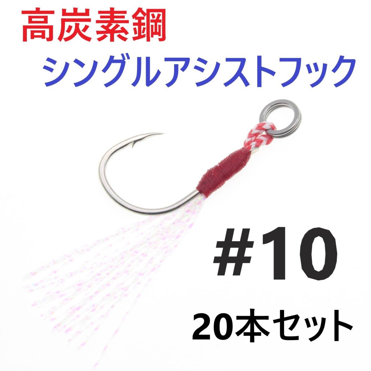 - 【送料無料】高炭素鋼 シングル アシストフック #10 20本セット ジギング メタルジグ 伊勢尼針 ティンセル スプリットリング付き