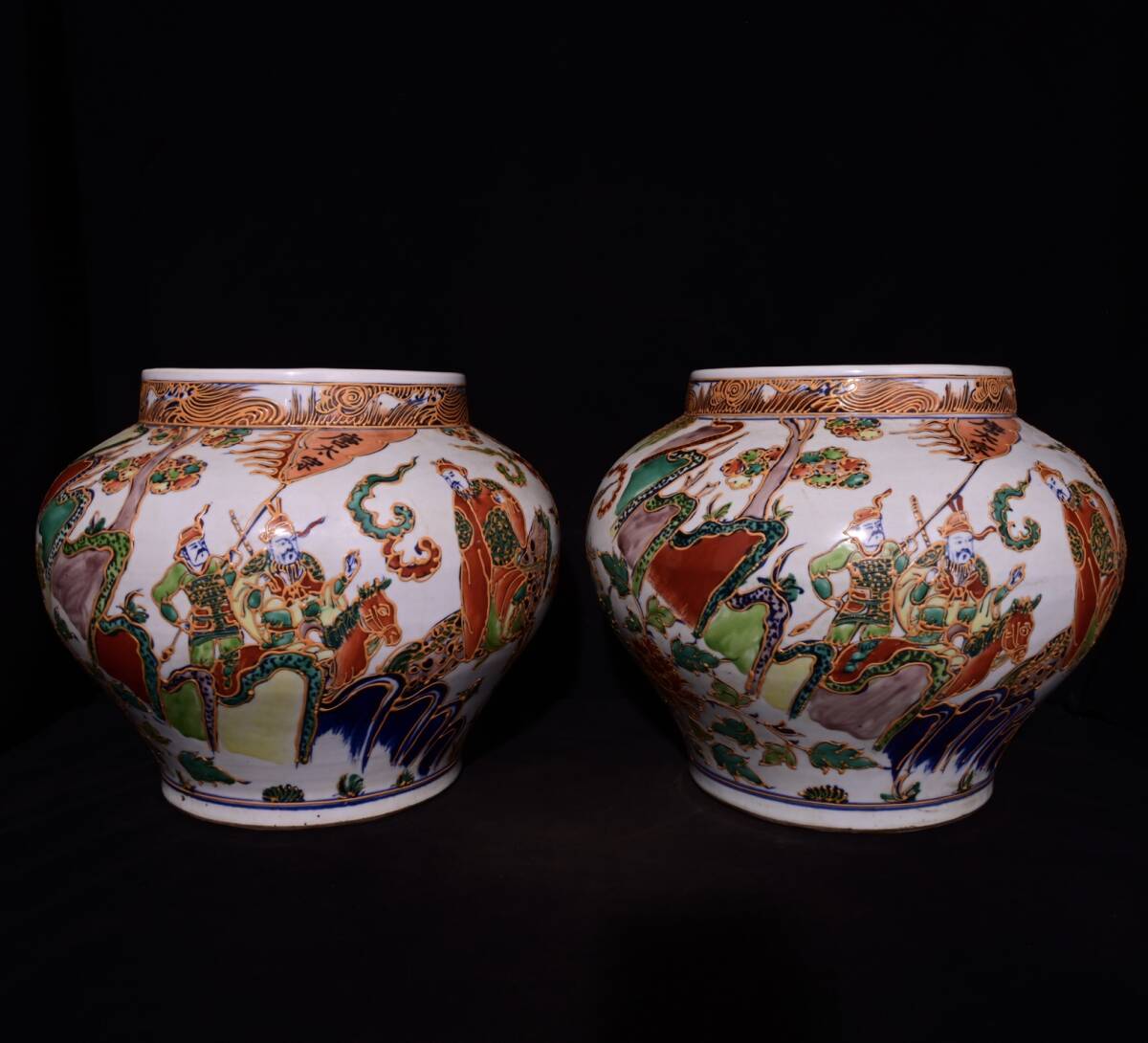 > A_YF0543【惠】人間国宝 中国骨董 陶芸 磁器【元五彩瀝粉太宗人物故事紋缶】工芸品 施釉陶 青花磁 陶芸 置物 收藏品