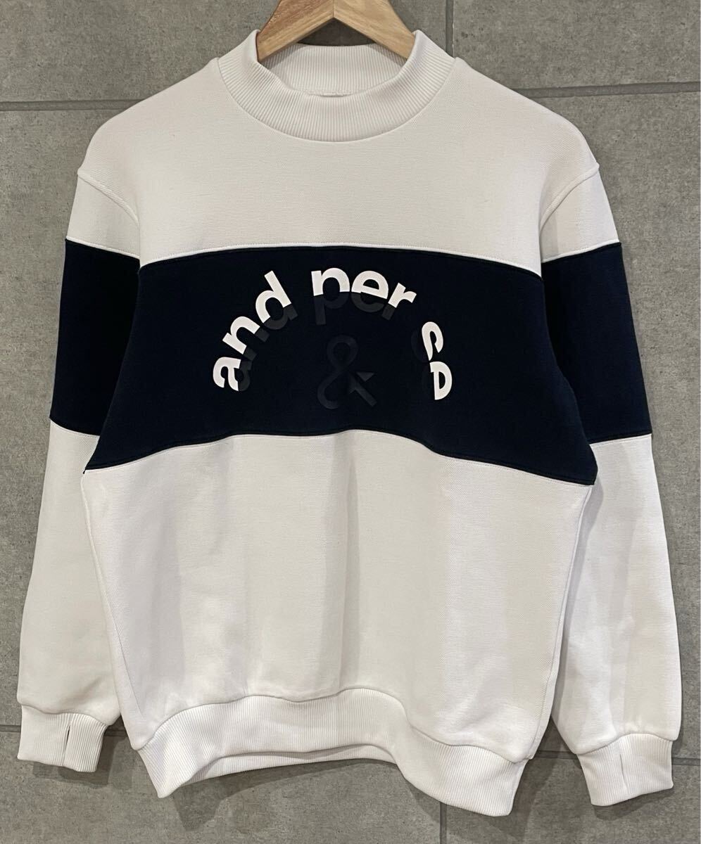 - 人気! and per se アンパスィ ロゴワッペン ストレッチ トレーナー ホワイト ネイビー Mサイズ メンズ ゴルフウェア ◯ 新規×