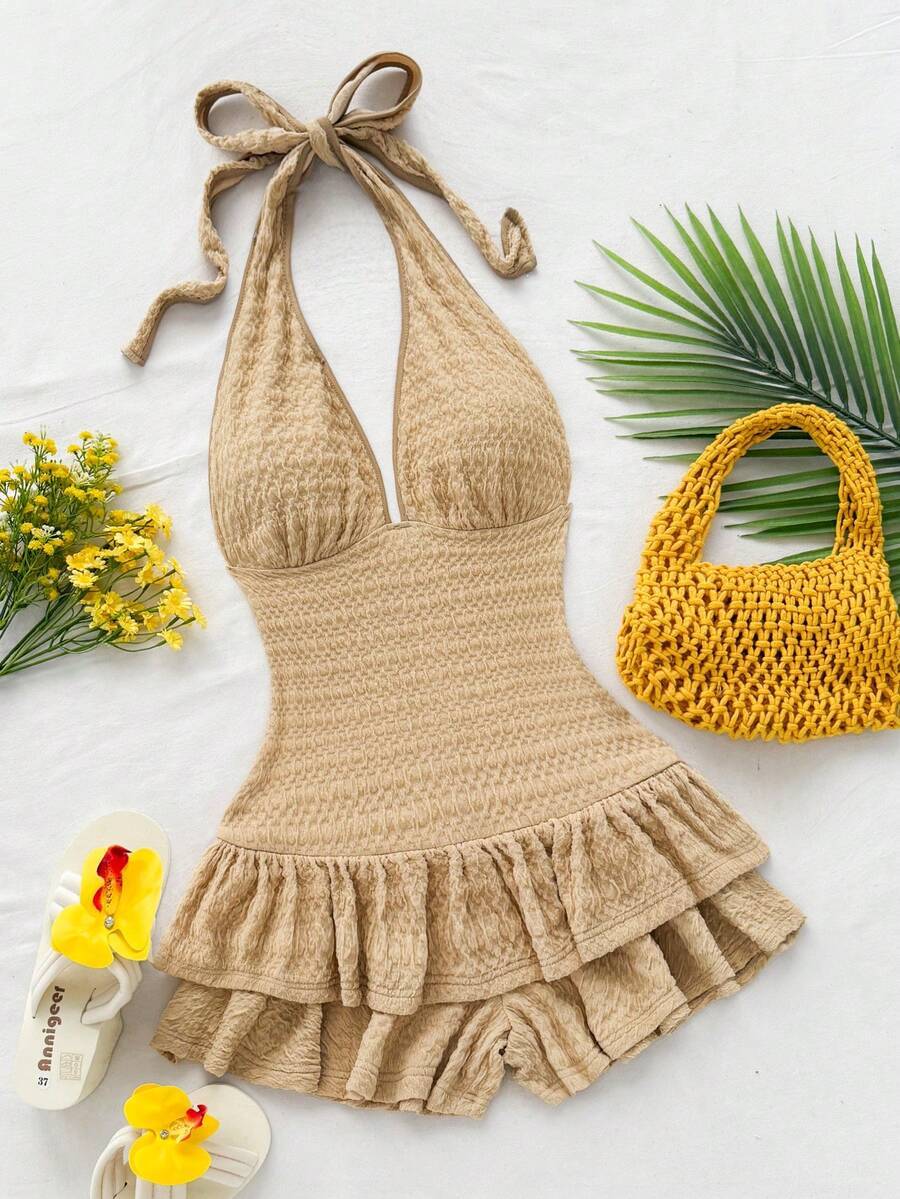 - ボディスーツ 女性用ホリデーホワイト ニット シワ加工 ネック ホルターネック ウエストタイ ラッフルヘムロンパース、パーティー、