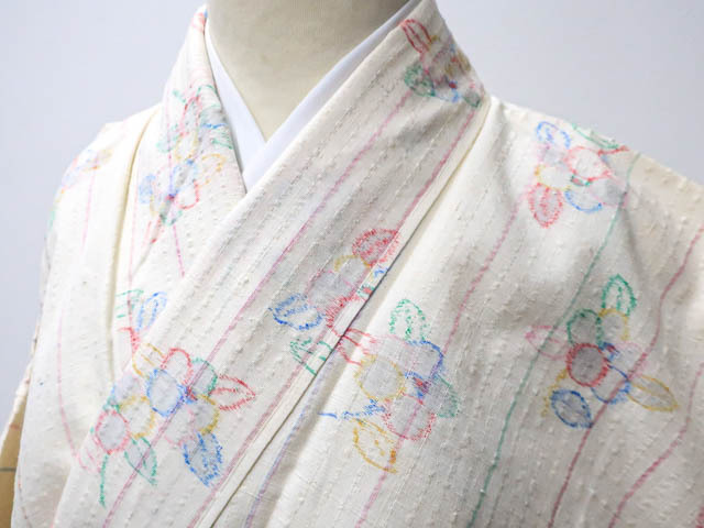 > 《京都一輝堂》【着物】紬 縞に花文 身丈約160cm 裄丈約66.5cm 24z-4296