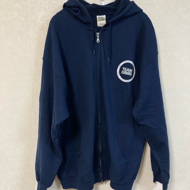 > B274 ギルダン XL アメリカ古着 コットンポリ 長袖 プリント ジップパーカー ネイビー系 GILDAN メンズ