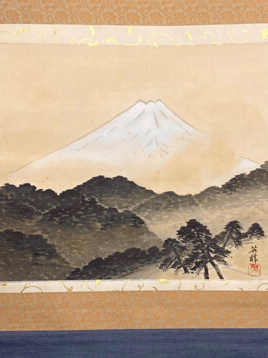> 【模写】英峰「不二山」絹本 共箱 富士 日本画 茶掛 茶道具 古美術 掛軸 掛け軸 中国 人が書いたもの 《魚亀》
