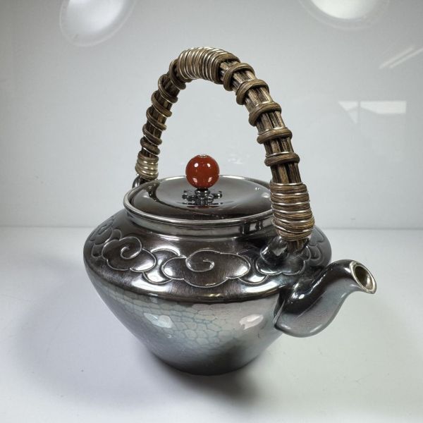 - 純銀製 雲彫 釜形 貴石摘 急須 煎茶 銀瓶 美術品 純銀保証