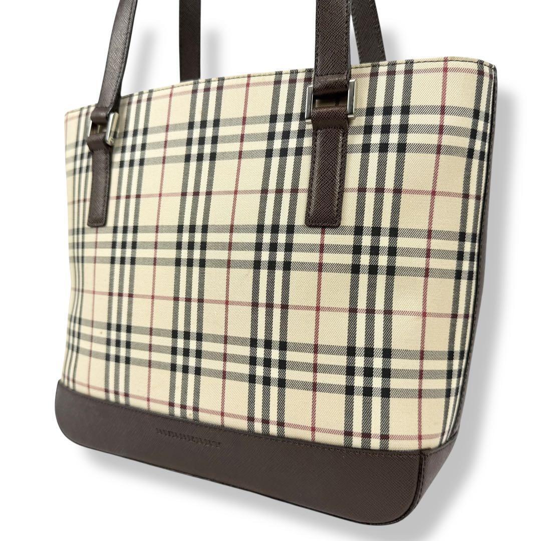 - 【美品/近現行】Burberry バーバリー ロゴ刻印入り トート ハンド バッグ 肩掛け カバン ノバチェック キャンバス サフィアーノ レザー