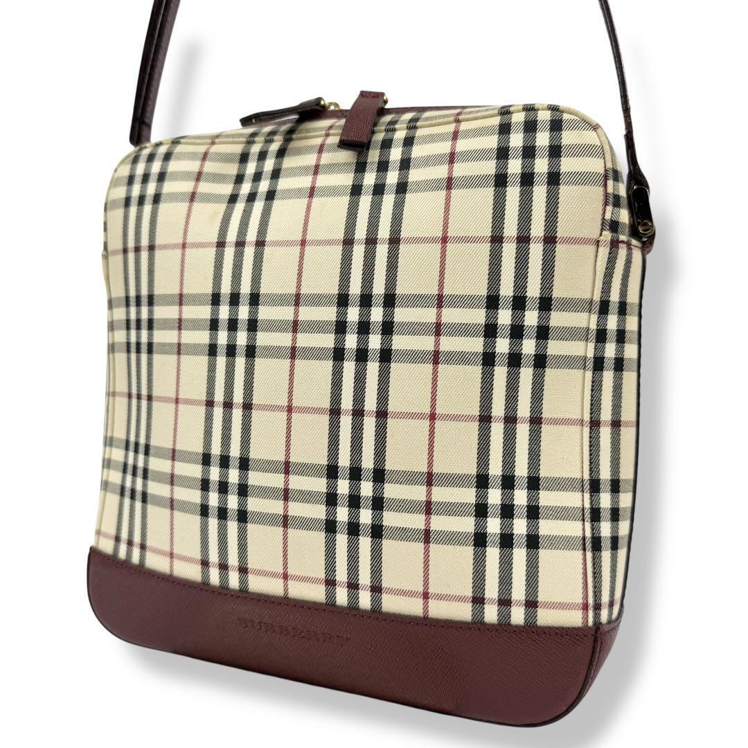 > 【近現行】Burberry バーバリー ロゴ刻印入り ノバチェック ミニ カバン ポシェット ショルダーバッグ 斜めがけ ベージュ 赤 レッド
